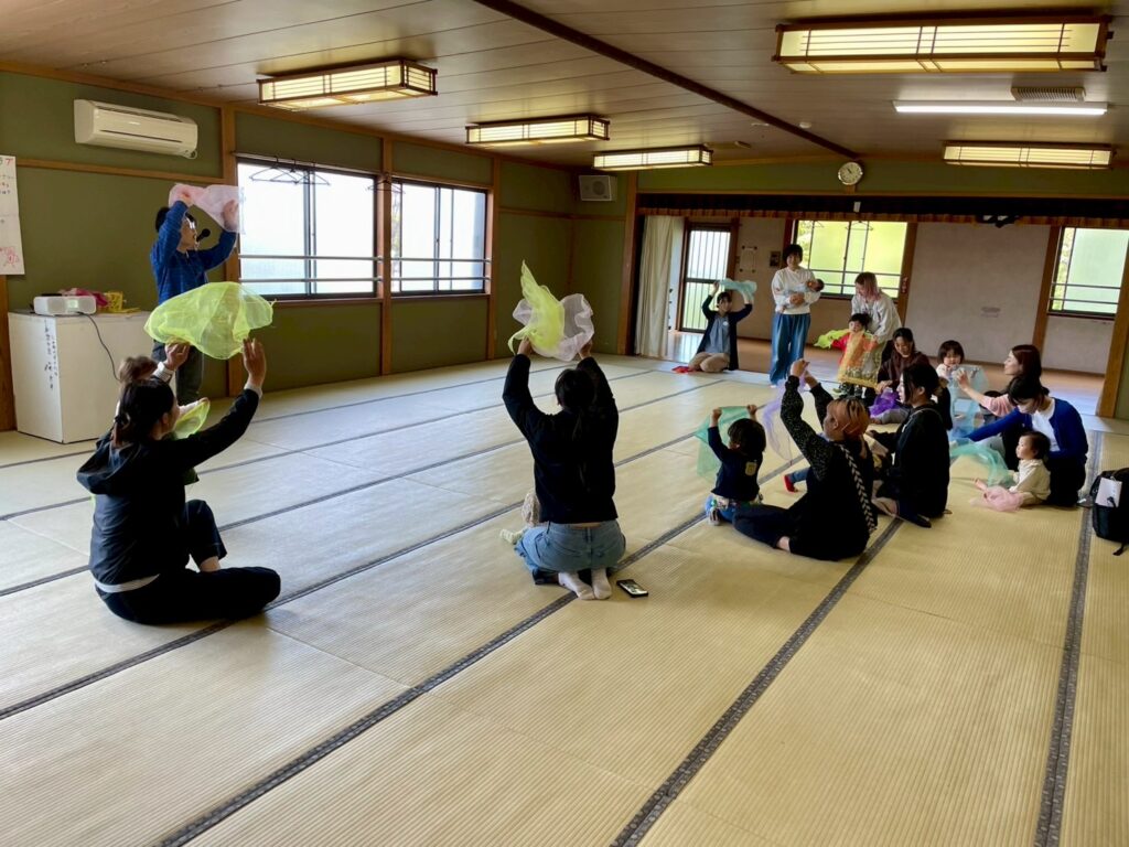 次はスカーフをみんなに配りました。「上から下から大風こい」や「いないいないばあ」で遊んだり「にぎりぱっちり」でおてての中に包んだスカーフがふわふわふわっと広がって、ひよこになったり、ちょうちょになったり、ゾウさんになったり?最後はヘリコプターになって飛んでいきました!