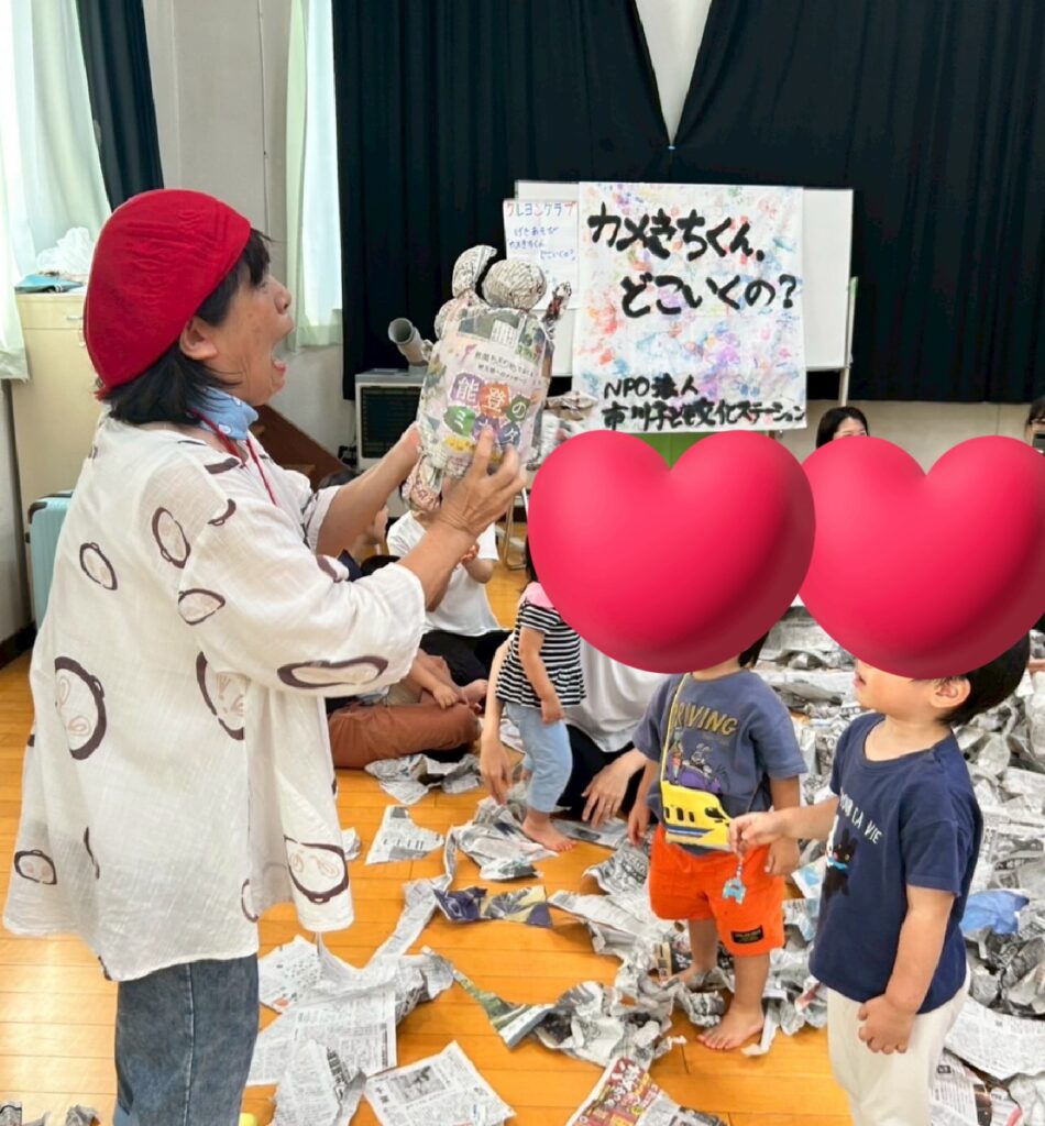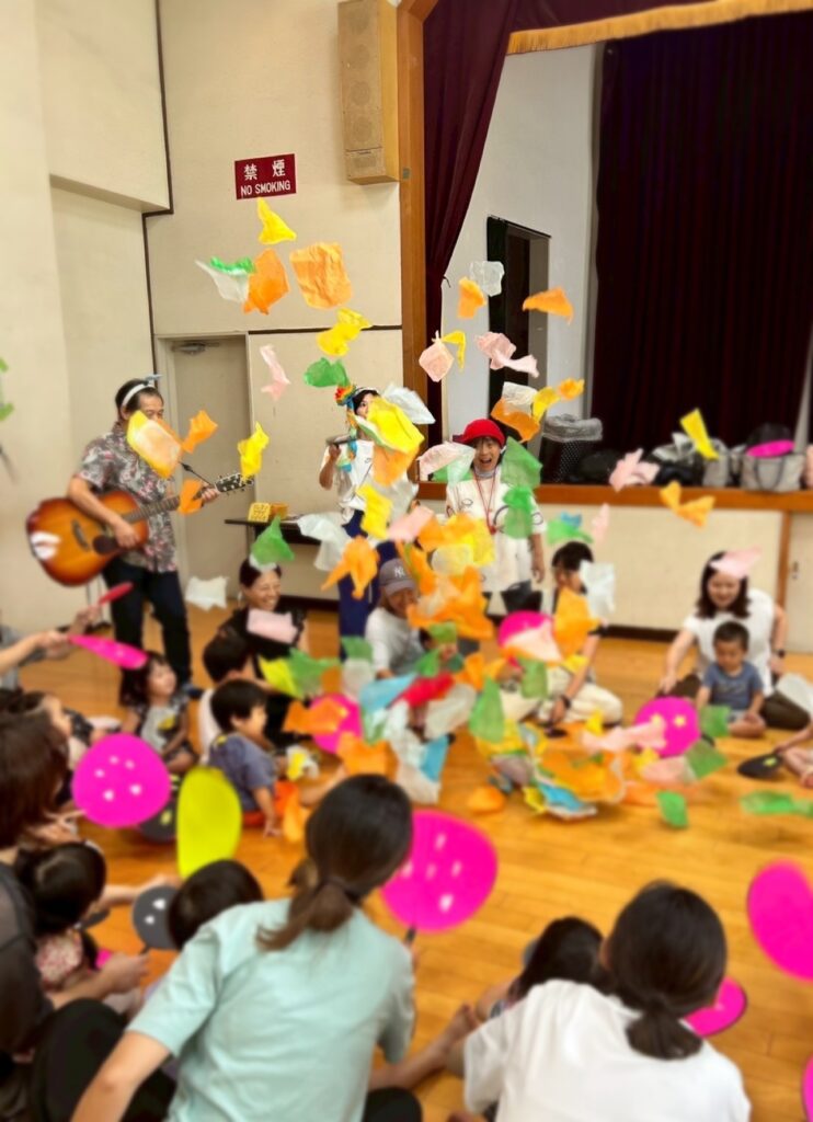 大量の新聞紙、皆でうちわをあおぐことで紙が浮かぶこと、ホイッスルの音、ギターの音色など新鮮で楽しんでいるのがわかりました。子の五感をたくさん刺激していただき、ありがとうございました。