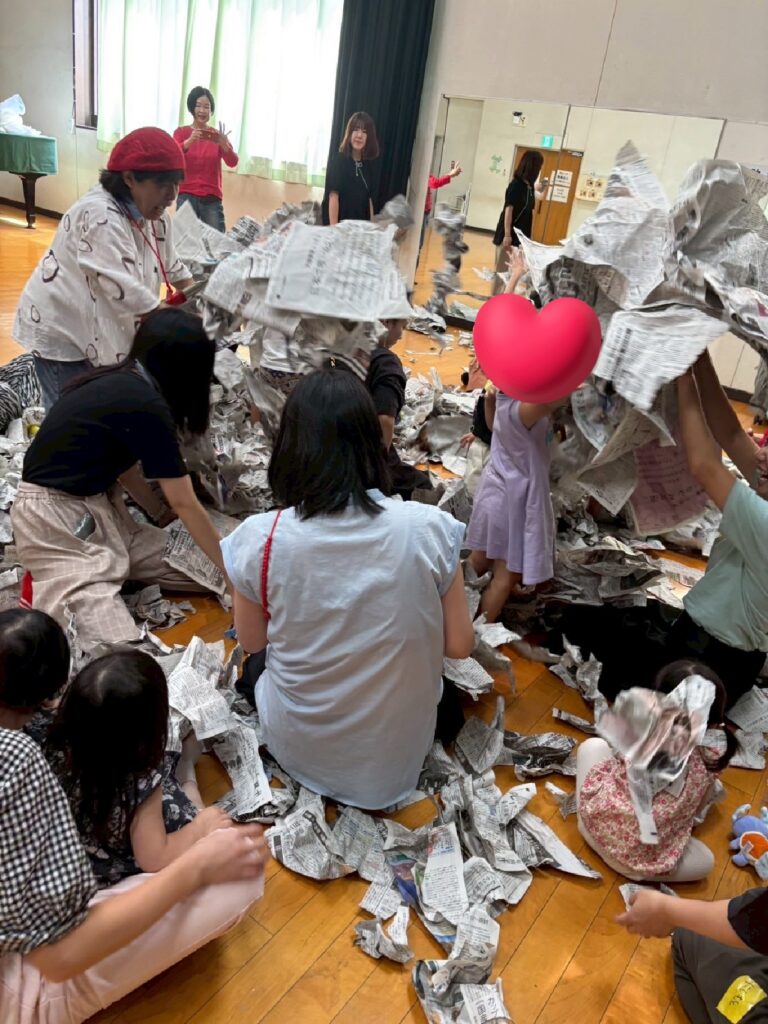 慣れるのに時間がかかるので最初はポカーンとしてるだけでしたが新聞紙の量に大興奮でニコニコ遊んでいる姿が見れてとても良かったです。家ではなかなかここまではできないので楽しいイベントでした。家の中にいるとついついスマホやテレビを見せていますが、感覚遊びをもっとやっていきたいと思いました。ありがとうございました。