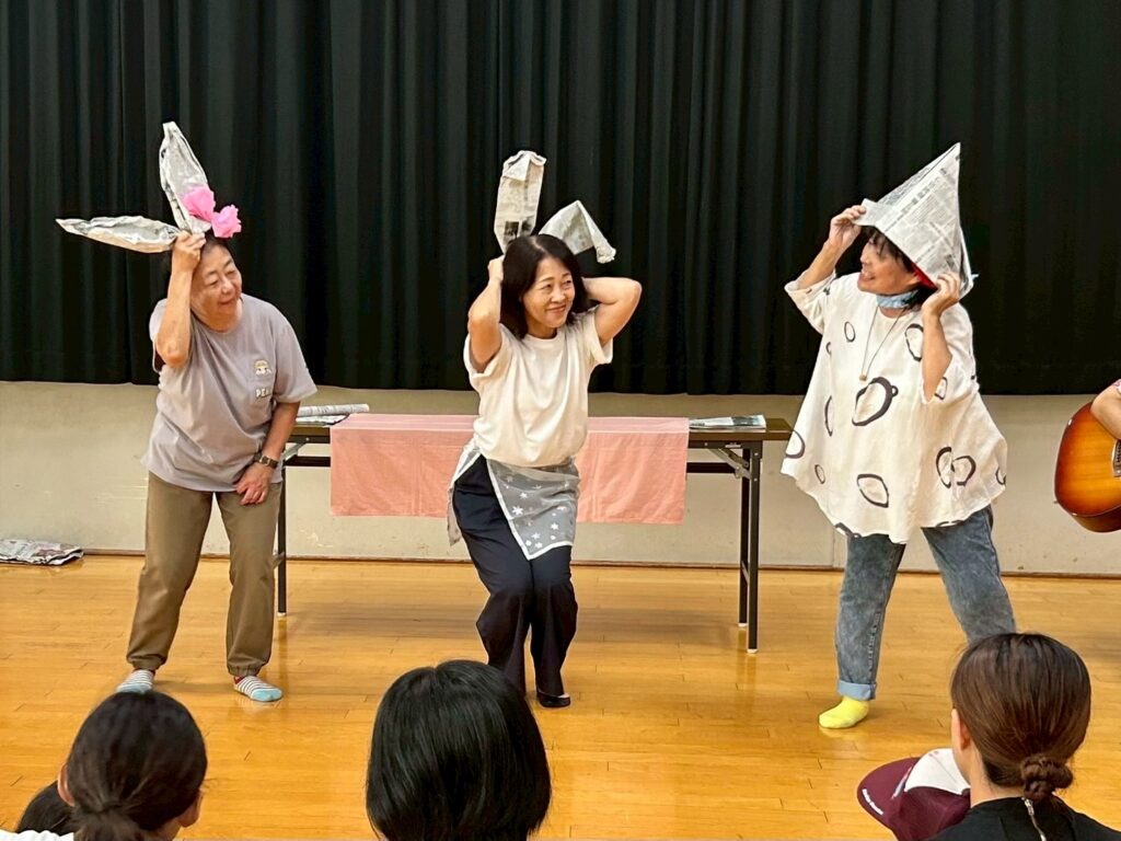 うさぎの森企画の大森靖枝さんとあそびうた作家の三根政信さんをお迎えして、新聞紙をたくさん使った劇遊びをしました。大森さんの手にかかると新聞紙が魔法のように色んなものに変身!どんどん世界が広がって、楽しくて、みんな目がキラキラ。新聞紙遊びも親子でとっても盛り上がりました。最後にみんなで協力して生み出した虹の海、きれいだったね!