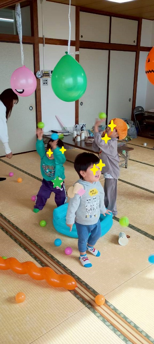 工作の後は、遊びです。おばけ顔の風船をねらってボールをぶつけよう!