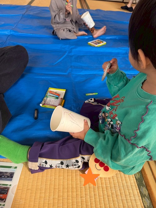 まずは紙コップでおばけ提灯つくり~