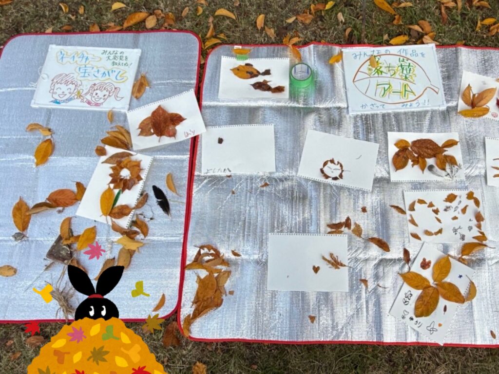 自然にある葉っぱや綿毛など、自然の中のお宝を探すゲームです。一生懸命探して見つけた子には、宝箱からごほうびをプレゼント。ちょっとした発見が嬉しい時間でした。