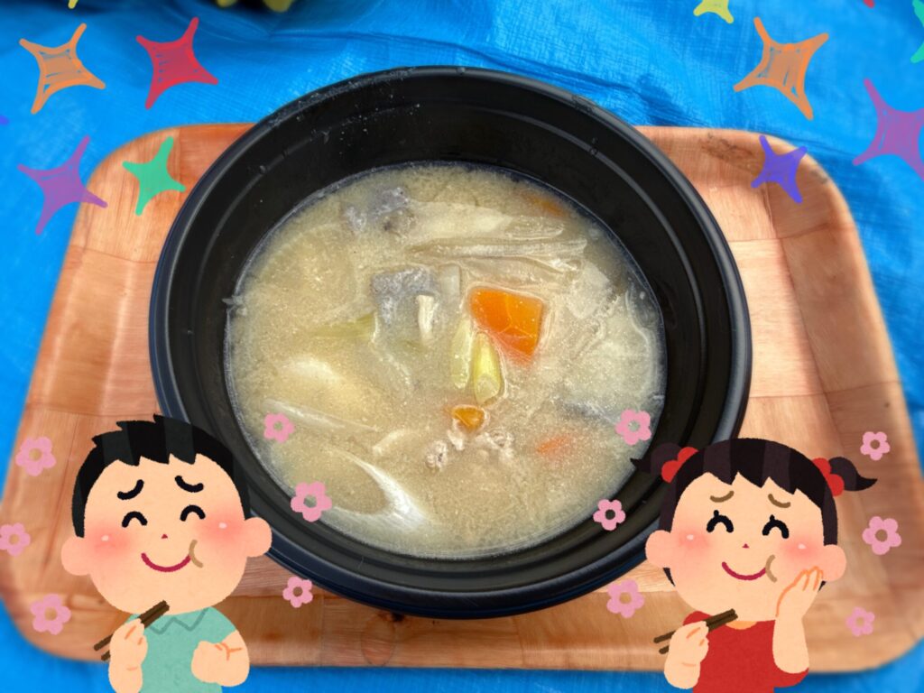 宝探しの後は、お腹もペコペコ!外で食べる豚汁は、あたたかくて思わず笑顔になるおいしさです。