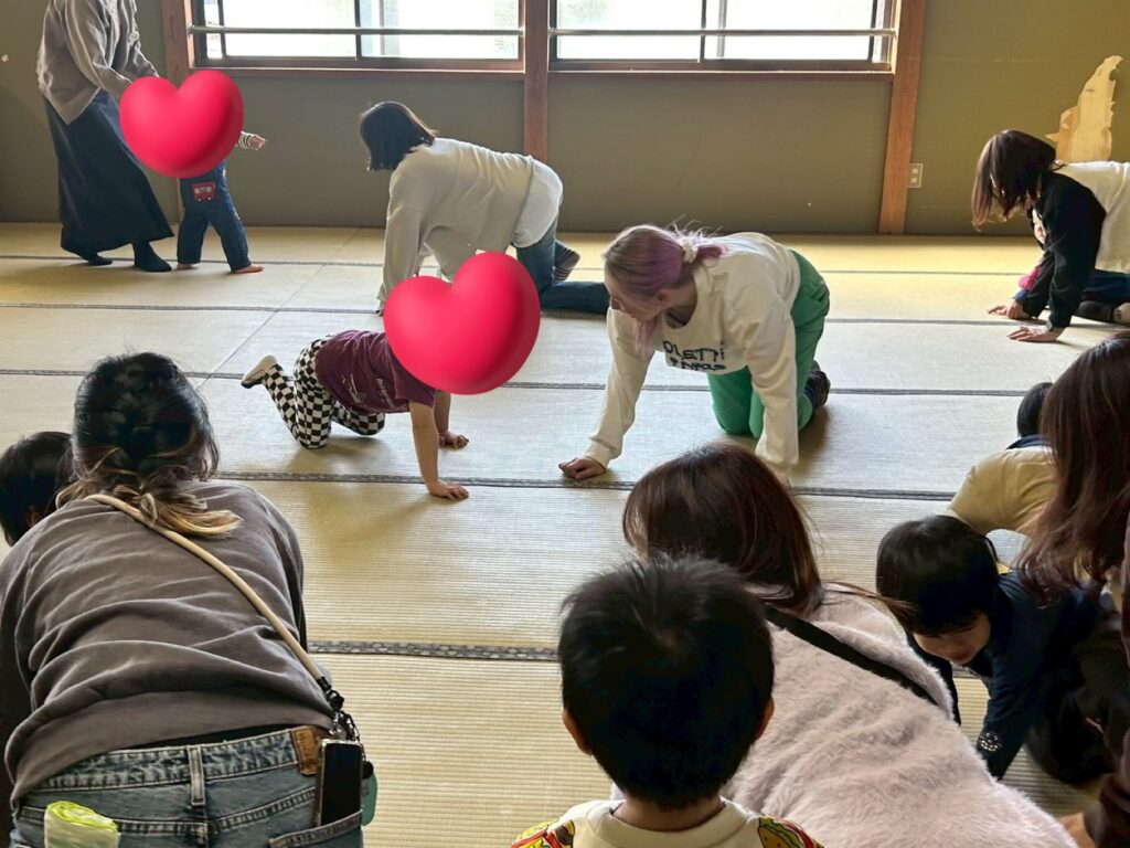 ウオーミングアップはごろーんと寝転がって足をぶらぶらするところから。座ったまま動いたり、猫やライオンや猿になって動いたり、お母さんもみんなも手足を大きく使って色んな動きを楽しみました。
