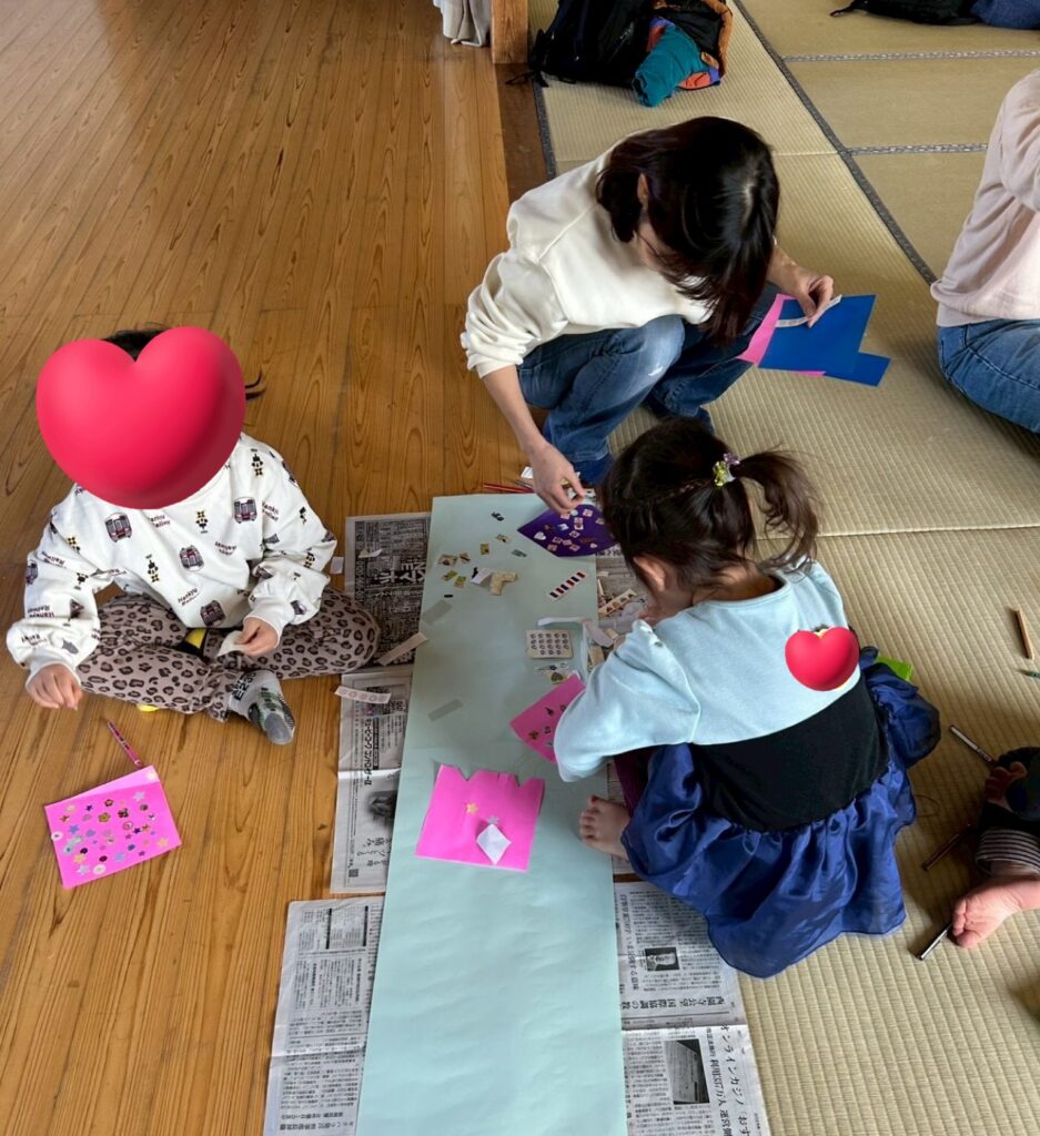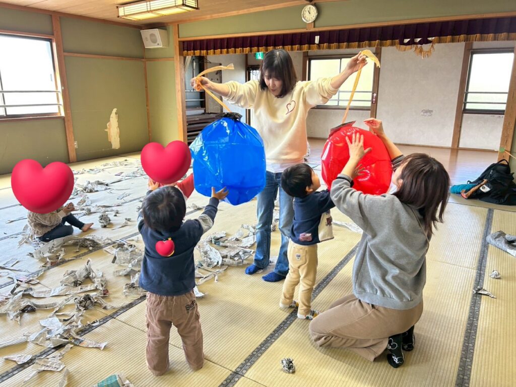 子どもたちは、スタッフと一緒にロールペーパーにお絵描きしたり、折り紙やシールを貼ったり、新聞をビリビリしたり、風船にパンチしたりして、自由に元気いっぱい遊びました!