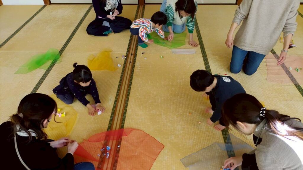 歌を歌いながら、身体を動かしたり、色とりどりのシフォンを使ったり、折り紙でお豆を作り、節分遊びも楽しみました♪