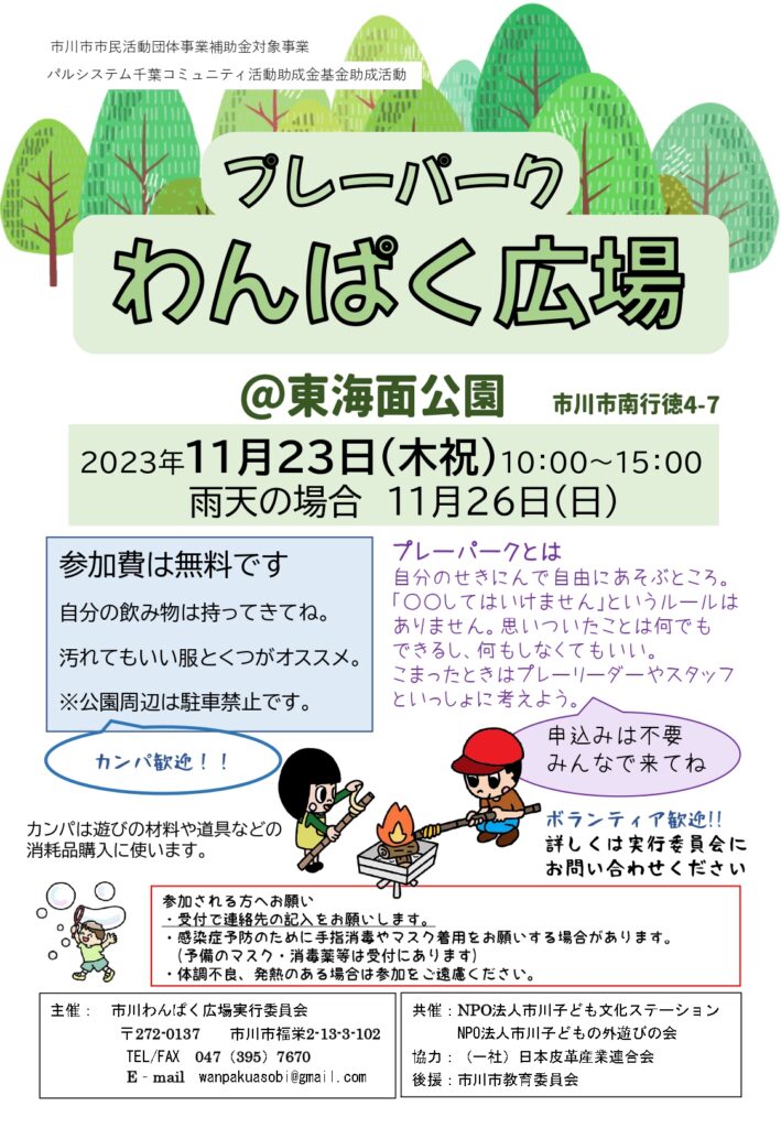 プレーパーク「わんぱく広場」 2023/11/23 木曜日 秋の公園で思いっきりあそぼう 自分の責任で自由に遊ぶプレーバークだよ! 2023年11月23日(木祝)10:00~15:00 雨天の場合 11月26日(日)に延期 東海面公園(市川市南行徳4-7) 参加無料 申し込み不要 « 前のページ 次のページ »