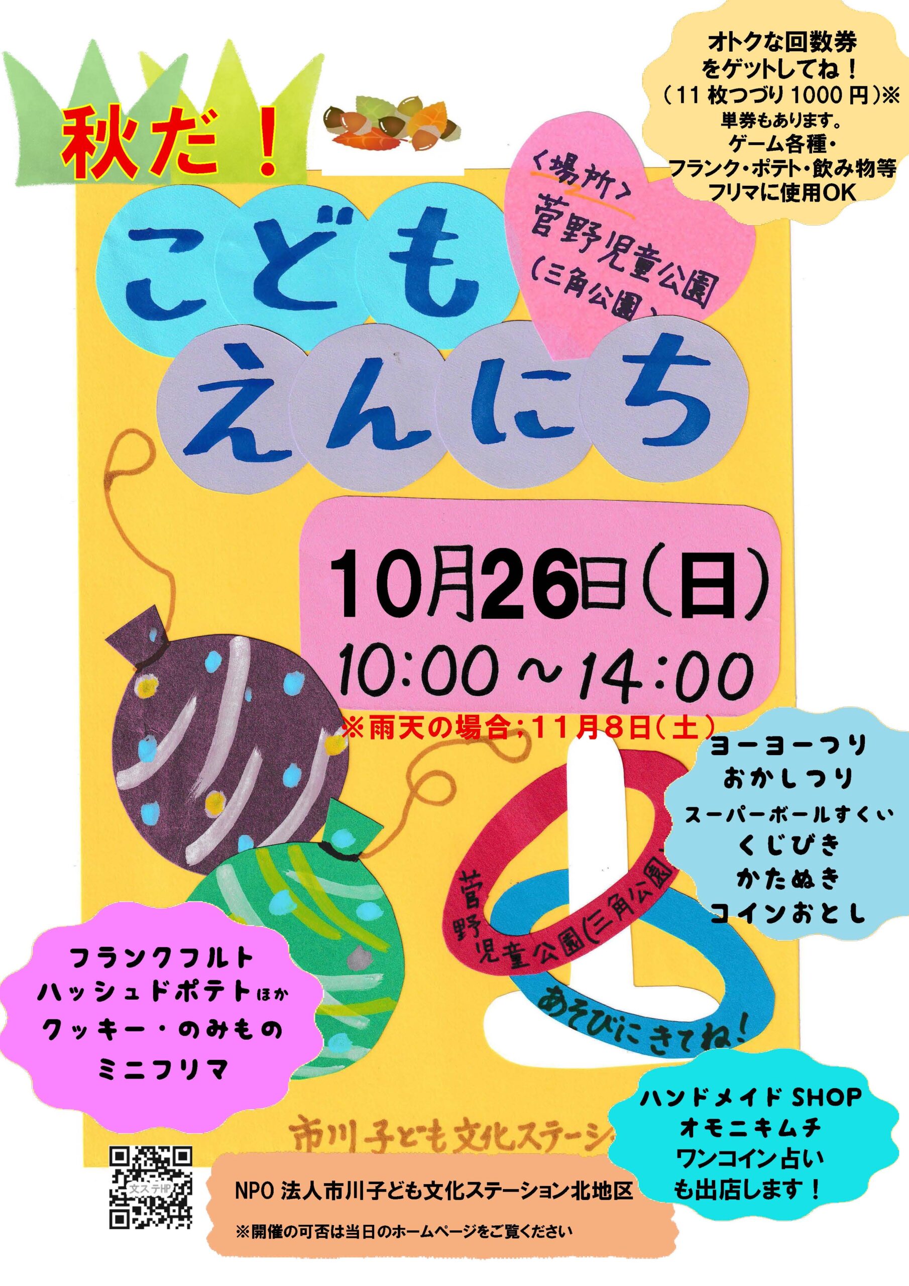 北地区 (11/8 に延期)秋だ⁈ こどもえんにち 2025 2025/11/08 土曜日 ※雨予報のため11/8に延期します。 日時:2025年10月26日10:00~14:00 雨天時11/8(土) 場所:三角公園(菅野児童公園) 予定 くじ各種、型抜き、水ヨーヨー、輪投げ、ミニバザー、飲み物、軽食など(現在企画中) 100 円から楽しめます♪ « 前のページ 次のページ »