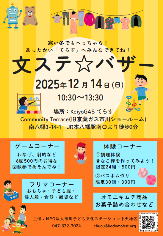 自由参加 注目 文ステ☆2025冬バザー&子どもえんにち@「てらす」 2025/12/14 日曜日 2025年12月14日(日) 10:30~13:30 時間帯が早くなっています! ●フリーマーケット 掘り出し物イッパイ♪ ご家庭に眠る不用品が必要な人の手に渡ります、 それはSDGsにつながります ●ゲーム*えんにちコーナーもパワーアップ! 空き缶つみ・水中コイン落とし・ボウリング・射的 ピンポンカップイン・わなげ・くじびき・幼児コーナーあり(回数券がお得です) ★ご注意:会場の「てらす」には駐輪場は少ないので、近隣の駐輪場(有料)をご利用も想定してください(スーパー西友・ドン・キホーテ周辺・他が便利です) ☆回数券であそべる 子どもの縁日、子どもが遊べるゲーム…楽しいことを企画中(お楽しみに!!) ☆乳幼児親子コーナーも企画中♪ « 前のページ 次のページ »