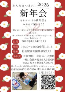 行徳地区 みんなあつまれ!新年会2026 2026/01/24 土曜日 みんなあつまれ!新年会2026 ~あそぶ・わらう新年会をみんなで楽しもう! 日程:2026年1月24日(土) 時間:13:30~15:30(受付13:15) 場所:駅前公園研修室(大) 参加費:会員無料 会員のパパ無料 一般、会員外きょうだい1人1500円 お試しで初めて参加1人500円 内容:お正月あそび(ふくわらい カルタ コマ等) 他全体あそびも企画中 申込はこちら 会員になって参加はこちら 申込〆切は1/17(土) 問い合わせ 行徳地区 047(395)7670 « 前のページ 次のページ »